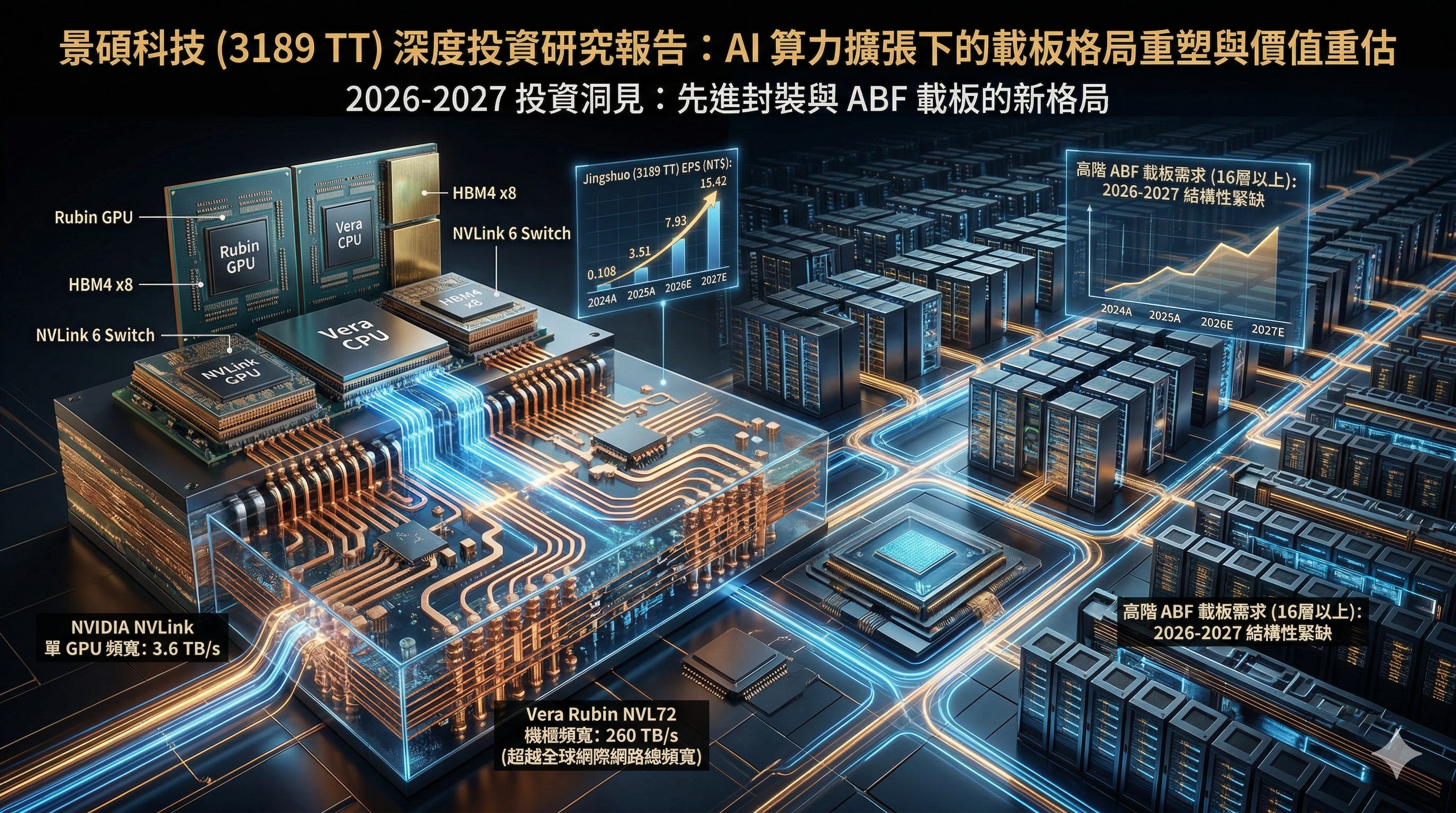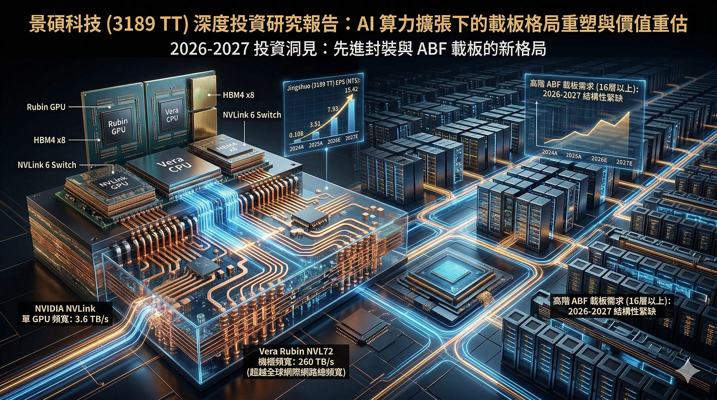 在這個典範轉移的歷史交會點上,景碩科技(3189 TT)正迎來其企業生命週期中最關鍵的價值重估階段。過去,景碩在 ABF 載板市場中多被定位為二線供應商,主要依賴 PC、遊戲機等消費性電子產品。然而,隨著產業龍頭 Ibiden 與欣興(Unimicron)的頂級產能被極端消耗,高階 ABF 載板市場在 2026 年出現了結構性的「需求溢出(Demand Overflow)」。景碩憑藉著在高層數載板技術的突圍,正式切入 NVIDIA 的 Vera 與 Rubin 供應鏈,並成功斬獲 Google、Meta 等美系雲端服務供應商(CSP)的特殊應用積體電路(ASIC)訂單 。本研究報告將採用由上而下的三階段分析架構,從衡量企業內在價值的「秤重機」、解讀市場預期的「投票機」,到落實交易與風險控管的實戰策略,全面剖析景碩在 AI 算力擴張浪潮下的投資價值與潛在風險。
