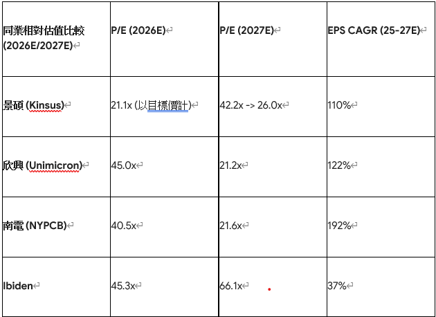 回顧景碩過去的歷史交易區間,其 12 個月遠期 P/E 曾高達 47 倍,歷史中位數約為 15 倍,而加上一個標準差(+1 std)則落在 21 倍左右 。考量到未來三年其盈餘年複合成長率(EPS CAGR)高達驚人的 110% (遠勝同業平均的 88%),以及營業利益率將從個位數回升至 15%-16% 的結構性改善,賦予其高於歷史中位數甚至接近歷史高位區間的估值倍數,是具備堅實基本面支撐的。