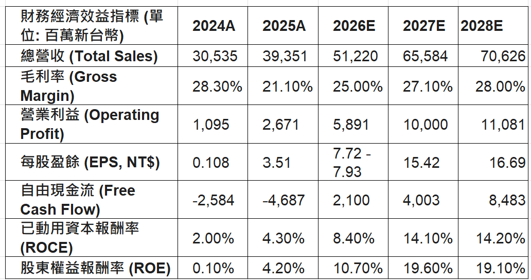 景碩的基本面正經歷從景氣谷底反彈到爆發性結構增長的質變。衡量其企業經濟效益的核心在於檢視其利潤率的擴張軌跡、投入資本回報率(ROIC / ROCE)的修復幅度,以及更重要的——真實現金流的轉折點。