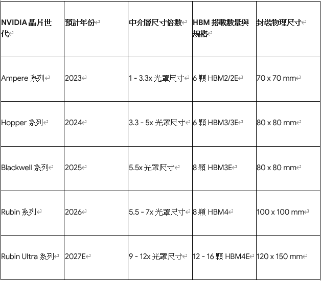 為了支撐如此龐大的資料吞吐量與第三代 Transformer Engine 的運算需求,AI 晶片的封裝尺寸與複雜度呈現幾何級數的增長 。從 Ampere 世代到 Rubin 世代,封裝尺寸預計將擴張至 100x100mm 甚至未來的 120x150mm 。這種物理尺寸的極限擴張,正對全球味之素堆積膜(ABF, Ajinomoto Build-up Film)載板產業提出前所未有的嚴苛要求。